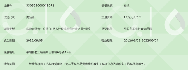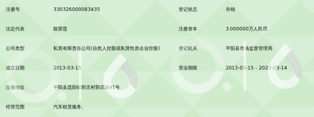 | 所属类型:汽车租赁 | 地址:温州市平阳县水头镇泾川东路658号 |