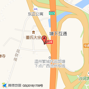 沿塘下互通途径A线大桥向南行驶1.1千米减速行驶到达收费站