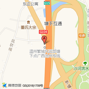 沿塘下互通途径A线大桥向南行驶1.1千米减速行驶到达收费站