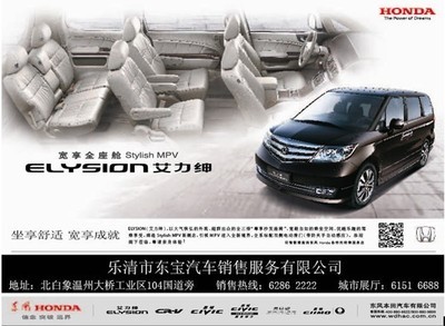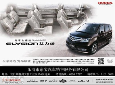 | 所属类型:汽车销售 | 地址:浙江省温州市乐清市北白象镇吹台山路东风本田汽车东宝特约销售服务店(北白象镇104国道高西村加油站旁) |