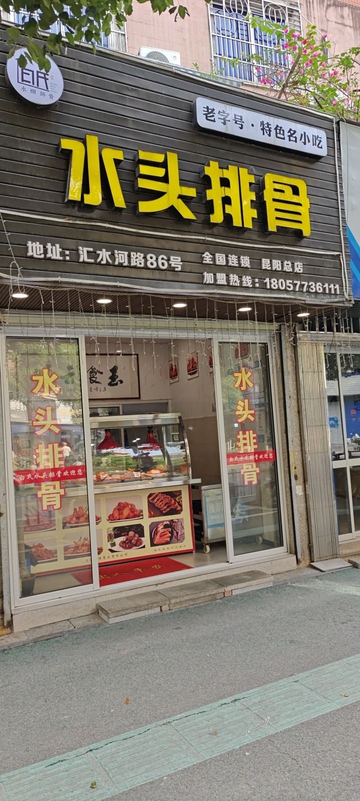 白氏水头排骨(总店)位于汇水河路与白石街交叉口东南60米(朝阳楼)商住两用楼宇东北方向6.04097米的位置。