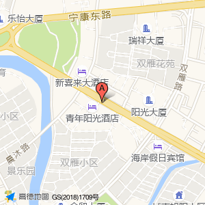 青年阳光酒店(旭阳路店)占地面积约:570㎡和浙江省温州市乐清市乐成街道双雁小区青年阳光酒店(旭阳路店)(旭阳路25号(晨沐路与旭阳路交叉口))相距 ⇄ 12.5215m