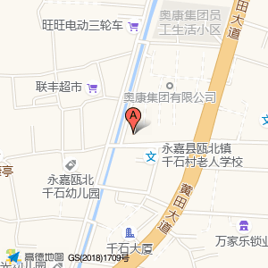 永嘉县瓯北镇千石村老人学校占地面积约:432㎡和浙江省温州市永嘉县黄田街道千石大街62奥康集团有限公司(千石社区卫生服务站东北)(千石工业区)相距 ⇄ 48.6066m