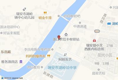 中通速递(瑞安公司湖岭分部)位于湖岭镇湖光南路2号(浙江农信丰收驿站)农村商业银行西南方向122.456米的位置。