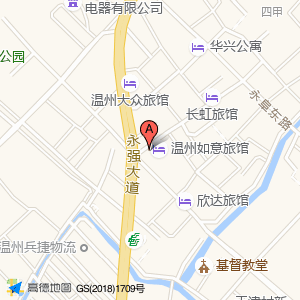 温州红日旅馆位于永强大道浦河街6号(大众饭店(浦河街店))中餐厅东方向1.62364米的位置。