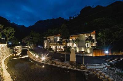 酒店地处洞头北岙南翼的半山自然村,原有村落民居以粗犷石屋为主,15幢石屋隐于U字形的山岙里,随意散布却错落有致,借地势之利又藏于山中酒店占地面积约30亩,建筑面积约4600平米,建筑15栋,客房总数量39个,设有18个标间,8幢别墅。区内配有餐厅、酒吧、书吧、花房,室内亲子游乐室,户外游泳池、户外亲子游乐区,户外烧烤平台等★坐公交车去温州伴·度假酒店可以选择在附近公交站点有浙江省温州市洞头区沙岙(公交站)上下车【距离51米】途经公交车有洞头6路白迭