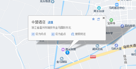 瑞安金马国际中盟酒店位于马陶线与322国道交叉口西140米(金马国际中盟酒店大堂)宾馆酒店南方向11.2582米的位置。