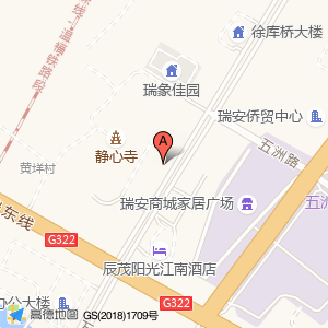 瑞安侨贸国际大酒店大堂位于江南大道与322国道交叉口北500米(徐库桥大楼)住宅小区东北方向294.807米的位置。
