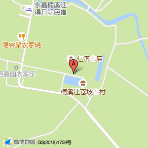 永嘉一笑轩客栈位于苍坡村(永嘉楠溪江得月轩民宿)住宿服务相关西北方向338.254米的位置。