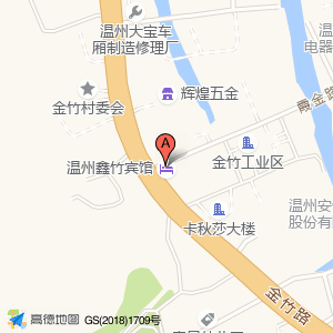 温州鑫竹宾馆位于金竹工业区霞金路432号辉煌五金店边上104国道河路交叉路口(浙江皮克机械设备有限公司)机械电子北方向40.1046米的位置。