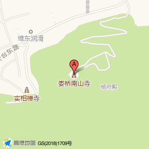 娄桥南山寺位于吹台东路与吹台中路交叉口东480米(杨府殿)寺庙道观西方向316.205米的位置。