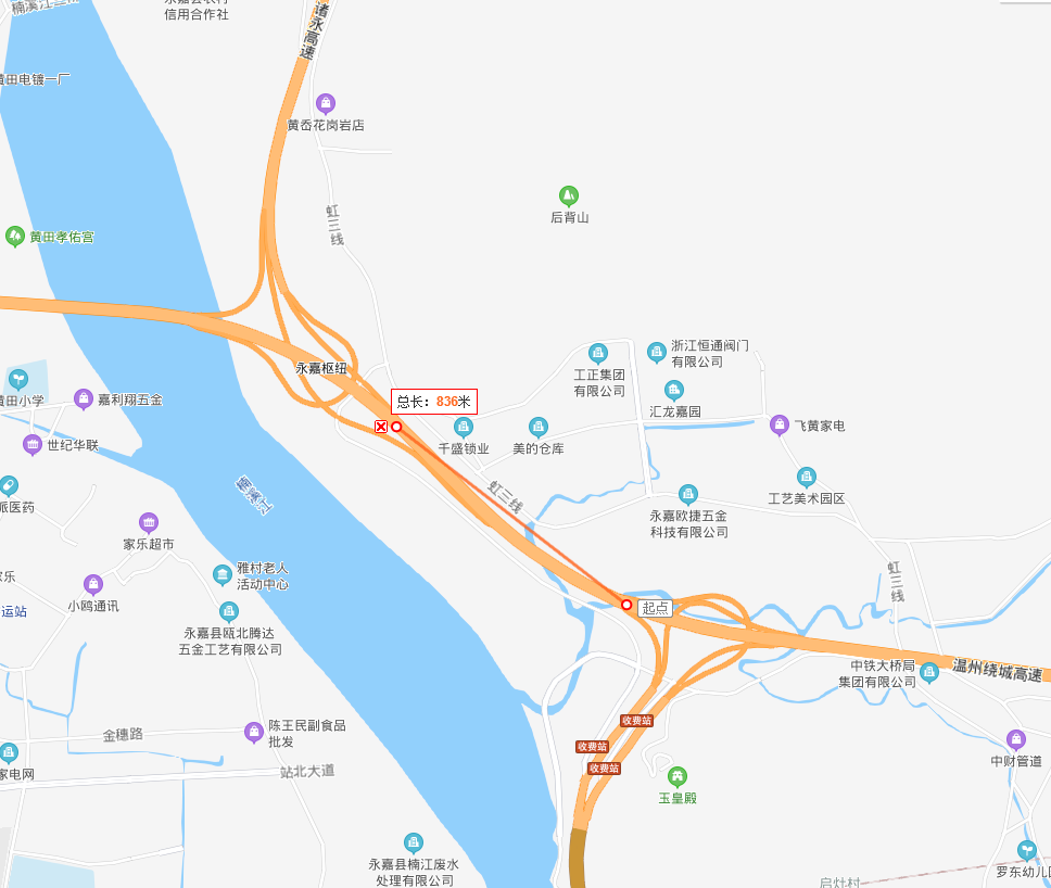 沿温州大道向东行驶954米右转