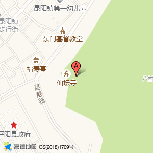 仙壇寺位于昆阳镇市解放街231号白石街与交汇处(风沐雨理疗推拿)医疗保健服务场所西方向279.332米的位置。