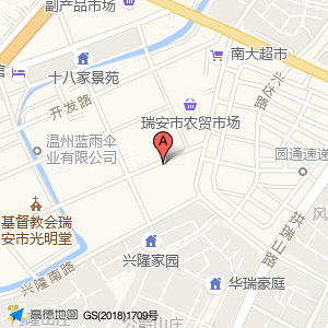 安阳基督教堂位于兴民路与兴隆南路交叉口西北46米(瑞安市农贸市场(光明路))农副产品市场东北方向129.127米的位置。