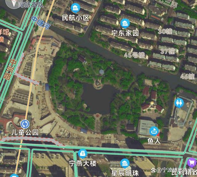 中塘河公园位于滨海大道东安村东北前埠村(宁海堂)寺庙道观西南方向859.307米的位置。