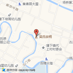 吴氏宗祠位于塘下镇场桥上灶村庙前路(吴氏宗祠)寺庙道观Center方向0米的位置。