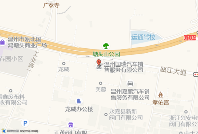 广泰寺位于瓯北新104国道塘头工业区(温州嘉鹏汽车销售服务有限公司)上海大众销售|上海大众维修东南方向465.803米的位置。