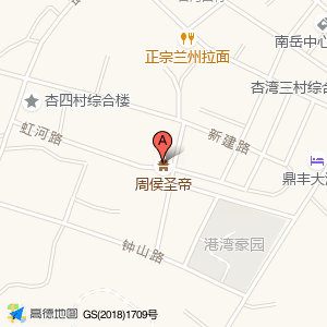 周侯圣帝位于南岳镇杏湾三村(鼎丰大酒店边上靠近虹南大道)(南岳杏三村文化健身广场)公园广场东方向272.62米的位置。