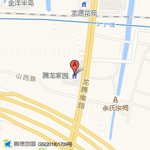 腾龙家园位于山西路与骄泰路交叉口西300米(余氏宗祠)寺庙道观东南方向197.064米的位置。