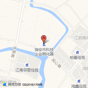 瑞安市科技企业孵化器位于民心路与保定路交叉口西北80米(鸿鑫花苑)住宅小区东南方向365.5米的位置。