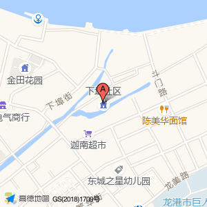 下埠社区位于龙台路与龙洲三街交叉口南20米(龙港市东城之星幼儿园警务联络点)社会治安机构东南方向202.58米的位置。