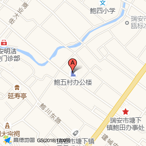 鲍五村办公楼位于瑞安市(鲍七村)村庄级地名西南方向351.536米的位置。