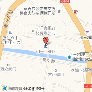和一工业区位于104国道与昌和路交叉口南180米(永嘉县公安局交通警察大队车辆管理所综合业务大厅)车辆管理机构东北方向245.009米的位置。