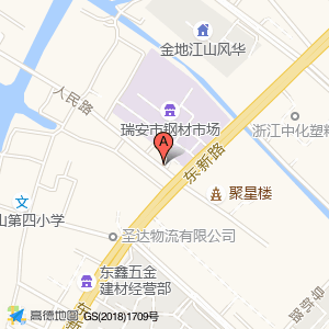 瑞安市钢材市场(东新路)占地面积约:22742㎡和温州市瑞安市下埠村办公楼西南门旁相距 ⇄ 18.4261m