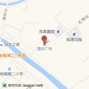 蒲岐广电位于虹南线与文运路交叉口东140米(兰庭佳园)住宅小区西方向179.867米的位置。