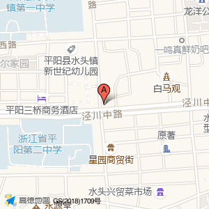 天马大酒店(泾川中路)占地面积约:497㎡和温州市平阳县水头镇二中路口相距 ⇄ 25.3851m