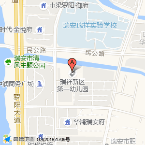 瑞祥新区第一幼儿园位于瑞莘路与罗阳大道交叉口东200米(华鸿瑞安府)住宅小区南方向214.576米的位置。