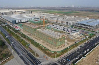 沿侨贸大道向西南行驶1.6千米右转