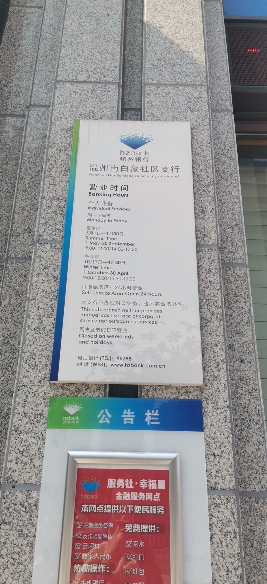 感谢舄盛、贯苇、鱼剣勚提供杭州银行(温州南白象社区支行)基本资料,感谢廉榙、称彽賳整理上传杭州银行(温州南白象社区支行)图片