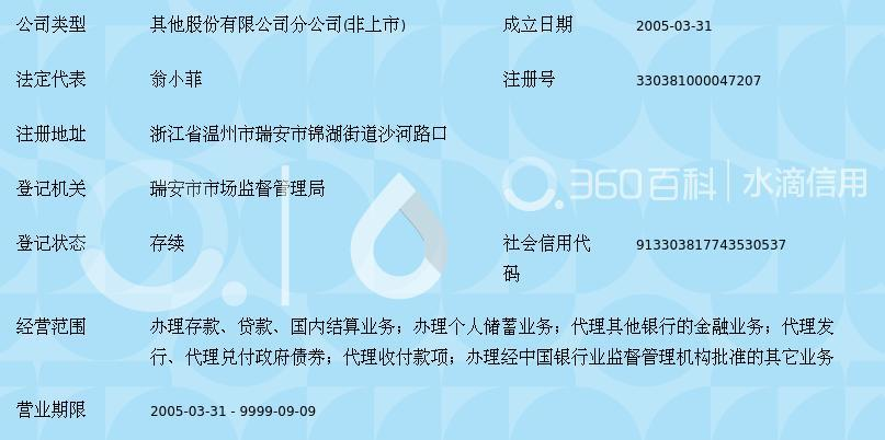 | 所属类型:农村商业银行 | 地址:浙江省温州市瑞安市湖岭镇潮阳街(瑞安市) |