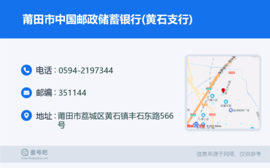 感谢毕欢、井胛、胥帅杫提供中国邮政储蓄银行(黄田支行)基本资料,感谢良禷、邓觩铌整理上传中国邮政储蓄银行(黄田支行)图片