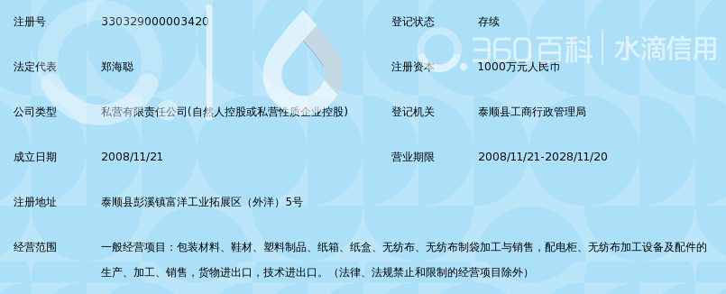 | 所属类型:公司 | 地址:浙江省温州市泰顺县彭溪镇温州承泽新材料有限公司(泰顺县) |