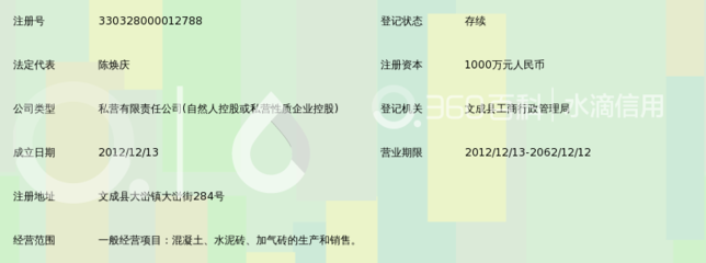 | 所属类型:公司企业 | 地址:浙江省温州市文成县百丈漈镇文成县龙翔混凝土有限公司(百丈漈镇外垟工业区) |