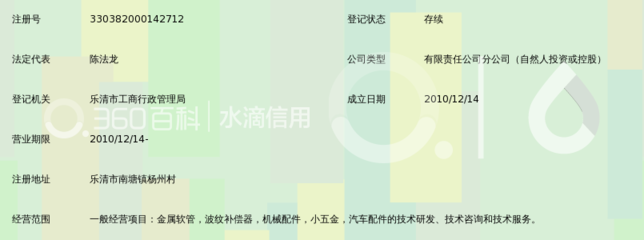 | 所属类型:公司 | 地址:浙江省温州市乐清市南塘镇浙江乐鼎波纹管有限公司(清江镇南塘亨乾口工业区) |