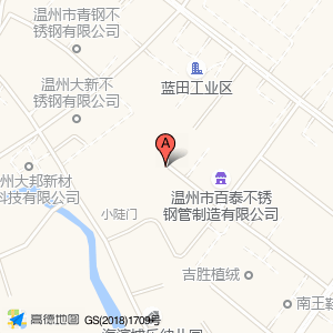 温州上成不锈钢有限公司位于蓝田标准厂房综合五区经三南支路8号(温州市百泰不锈钢管制造有限公司)建材五金市场|公司东方向106.673米的位置。