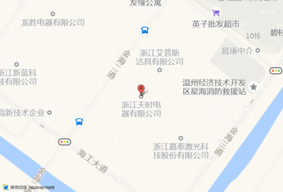 ★坐公交车去浙江天时电器有限公司可以选择在附近公交站点有浙江省温州市龙湾区金海二道滨海十九路(公交站)上下车【距离185米】途经公交车有159路;社区巴士金海3线;金海一线社区巴士