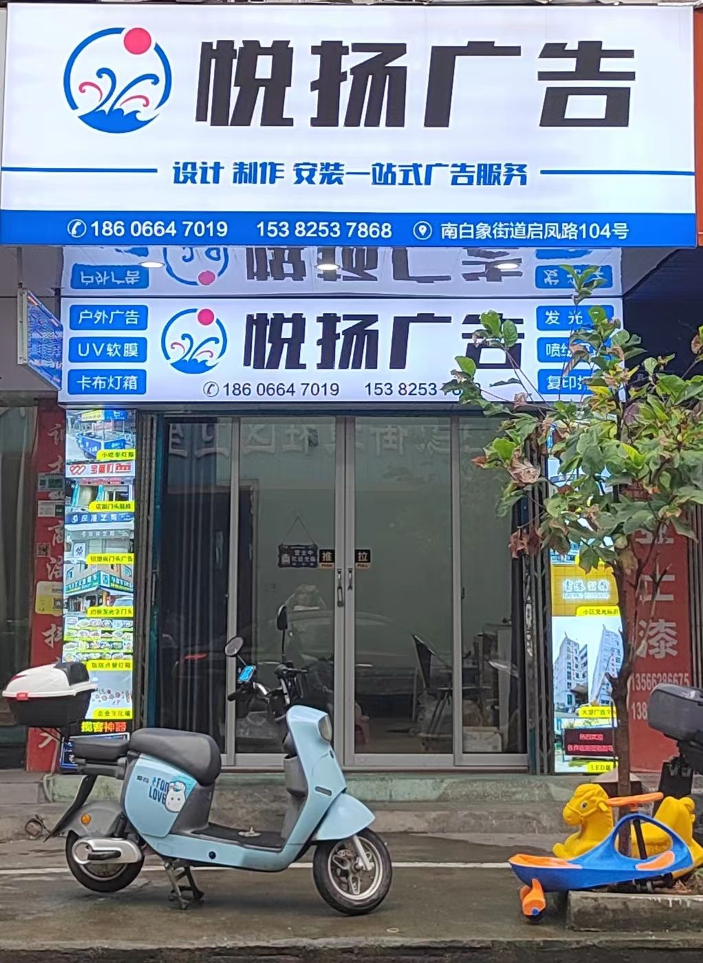 悦扬广告位于南白象街道启凤路57号(阿佑面馆)中餐厅北方向124.773米的位置。