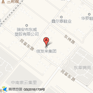 倍发来集团周边地名,附近道路有哪些,倍发来集团旁边有东纬路,兴业路,吉悦路,莘和路,民莘东路,东二路,吉德路,四平路,东一路,鼎力街,旭东路一巷,东进路,滨海大道,旭东路二巷,东升北路,九东线,安善路,周兴路,后岸路,瑞安中塘河绿道,等等地名。