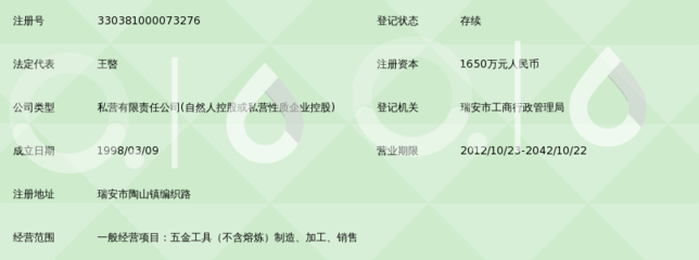 | 所属类型:公司 | 地址:浙江省温州市瑞安市陶山镇浙江国新工具有限公司(陶山镇陶北村编织路28号) |
