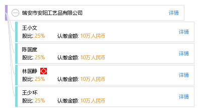 | 所属类型:公司企业 | 地址:浙江省温州市瑞安市林川镇强沙东路瑞安市安阳工艺品有限公司(繁香路附近) |