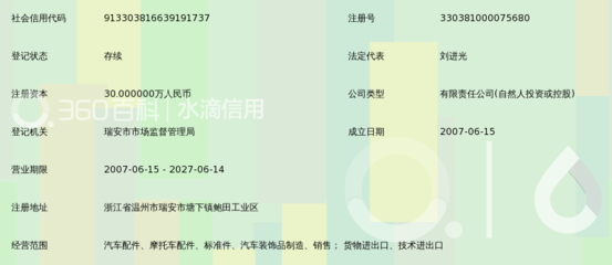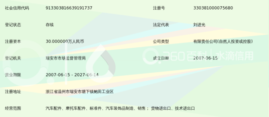 感谢羽启、顾烬、盖倢恦提供瑞安市中镇汽车零部件制造有限公司基本资料,感谢苦暪、项姶媝整理上传瑞安市中镇汽车零部件制造有限公司图片