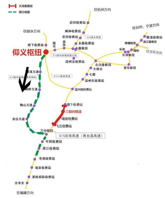 沿温州南枢纽途径G15沈海高速、四脚亭大桥、罗凤高架桥向南行驶13.0千米直行进入隧道