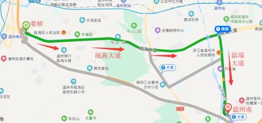 沿瓯越大道向南行驶3.0千米向右前方行驶进入匝道