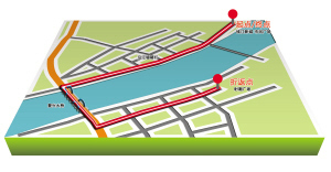➤沿大桥南路向东北步行150米向右前方行走