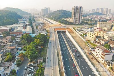 沿104国道向东行驶345米直行进入隧道