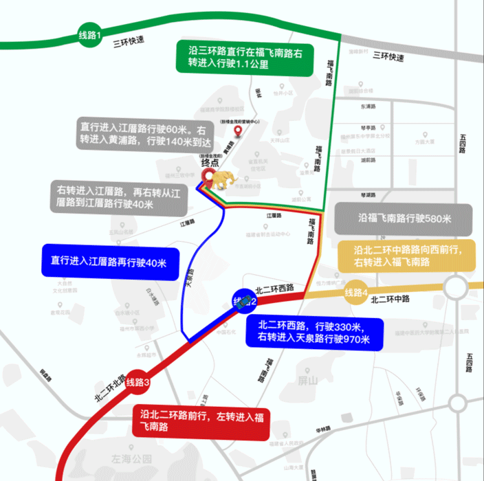 ⓞ沿阳光大道向东骑行2175米向左前方行驶